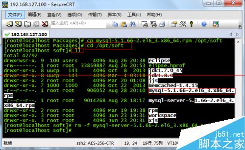 5、在命令行輸入: cp mysql-5.1.66-2.el6_3.x86_64.rpm /opt/soft。把mysql-5.1.66-2.el6_3.x86_64.rpm這個(gè)包拷貝到/opt/soft目錄下面。在命令行輸入:cd /opt/soft。然后ll。可以看到文件已經(jīng)被拷貝過(guò)去了。