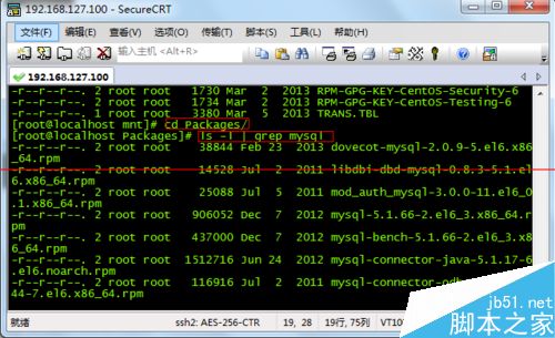 4、進(jìn)入到Packages目錄,在命令行輸入:cd Packages。然后輸入:ls -l | grep mysql。找到我們要拷貝出來(lái)的rpm包。
