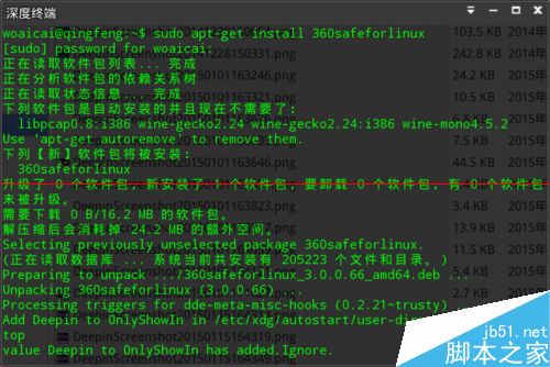 1、啟動深度終端,輸入"sudo apt-get install 360safeforlinux"回車,輸入管理員密碼