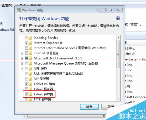 4/在“打開或關閉Windows功能”對話框中勾選“Telnet客戶端”,點擊確定,系統會自動安裝。到此Windows終端的工作已經完成。