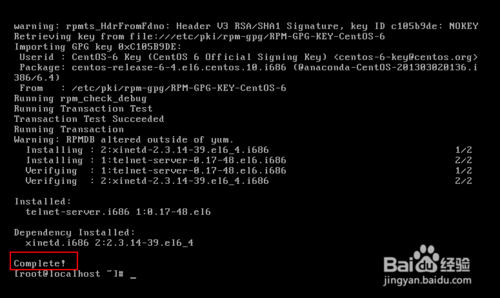 1、許多Linux系統在默認情況下是不安裝Telnet服務的,如果需要使用就必須安裝此項服務。安裝的方法有很多,小編在這里只介紹yum安裝Telnet服務,它的優點是能夠自動檢查安裝包的依賴文件不用人為干預,當然前提是系統必須聯網。在提示符下輸入“yum install -y telnet-server”命令安裝Telnet服務。最后出現Complete,代表安裝完成。