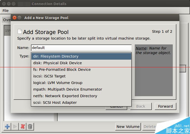 輸入新的存儲池的名字(比如:default),并且選擇存儲池的類型。本例中,因為我們只是改變存儲池目錄所以選擇“文件系統目錄”。
