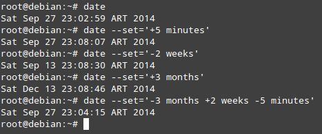 # date --set='+5 minutes'# date --set='-2 weeks'# date --set='+3 months'# date --set='-3 months +2 weeks -5 minutes'