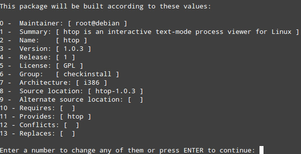 因此,要創建一個htop安裝包,我們可以不帶任何參數的調用checkinstall,這將使用“make install”命令創建一個包。在這個過程中, checkinstall命令會問你幾個問題。