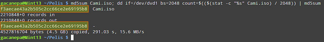 命令的第一部分計算.iso文件的md5校驗和,而第二部分則讀取/dev/dvd1中的磁盤內容,然后通過管道輸出給md5sum工具。“bs=2048”表示dd命令將使用2048字節塊為單位檢查,因為原始iso文件以2048為單位劃分。