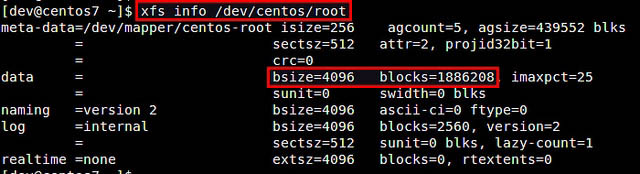 作為目標XFS文件系統來擴展,你可以指定掛載點、磁盤分區或者邏輯卷(在使用LVM時),使用數據塊數量來指定新的XFS文件系統的大小。你可以使用xfs_info命令行工具來檢查數據塊大小和數量: