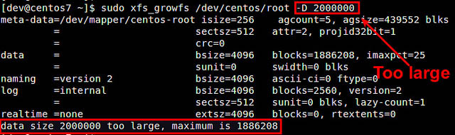 如果你不使用“-D”選項來指定大小,xfs_growfs將會自動擴展XFS文件系統到最大的可用大小。