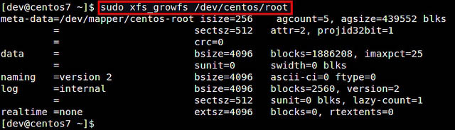 $ sudo xfs_growfs /dev/centos/root