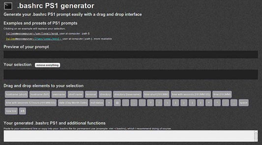 如果你想開始學習Linux命令行,或者想快速地生成一個自定義的shell命令提示符,但不知道從何下手,這個網站可以為你生成PS1提示的代碼,將代碼放到家目錄下的.bashrc文件中即可。你可以拖拽任何你想在提示符里看到的元素,譬如用戶名和當前時間,這個網站都會為你編寫易懂可讀的代碼。絕對是懶人必備!