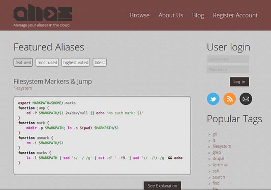 另一協作式數據庫,alias.sh(我愛死這個URL了)有點像commandlinefu,但是為shell別名開發的。你可以共享和發現一些有用的別名,來使你的CLI(命令行界面)體驗更加舒服。我個人喜歡這個獲取圖片維度的別名命令。