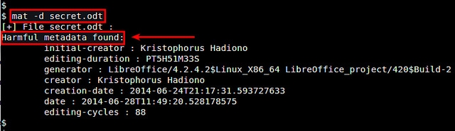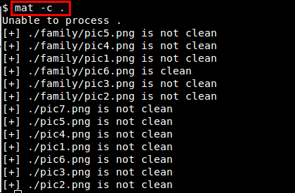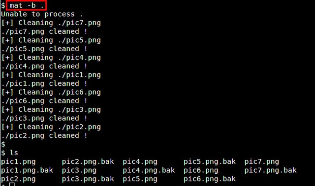如果不為mat命令提供任何選項,默認操作會移除文件的元數據。如果要在清理的過程中保留原始文件的備份,使用“-b”選項。下面命令會清除所有文件的元數據,并將原始文件存儲為“*.bak”文件。
