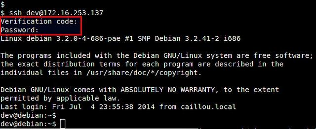 當(dāng)提示你輸入驗(yàn)證碼的時(shí)候,輸入我們剛獲得的驗(yàn)證碼。驗(yàn)證成功后,再輸入SSH的登錄密碼。