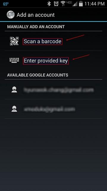 你可以選擇"Scan a barcode" 或者"Enter provided key"選項(xiàng)。"Scan a barcode"允許你掃描QR碼來(lái)完成密鑰的輸入,在此可能需要先安裝掃描軟件Barcode Scanner app。如果選擇"Enter provided key"選項(xiàng),你可以使用鍵盤(pán)輸入驗(yàn)證密鑰,如下圖所示: