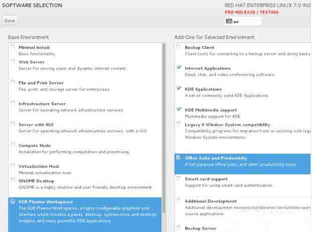 在安裝時,我們可以選擇多種類型的基礎環境:最小基礎設施服務器,文件和打印服務器,基本的web服務器,虛擬主機和服務器的GUI。每個選擇都必須選擇一套組件。
