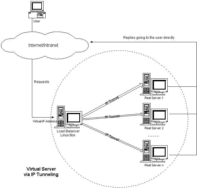 在VS/TUN 的集群系統(tǒng)中,負載調(diào)度器只將請求調(diào)度到不同的后端服務(wù)器,后端服務(wù)器將應(yīng)答的數(shù)據(jù)直接返回給用戶。這樣,負載調(diào)度器就可以處理大量的請求,它甚至可以調(diào)度百臺以上的服務(wù)器(同等規(guī)模的服務(wù)器),而它不會成為系統(tǒng)的瓶頸。即使負載調(diào)度器只有100Mbps的全雙工網(wǎng)卡,整個系統(tǒng)的最大吞吐量可超過 1Gbps。所以,VS/TUN可以極大地增加負載調(diào)度器調(diào)度的服務(wù)器數(shù)量。VS/TUN調(diào)度器可以調(diào)度上百臺服務(wù)器,而它本身不會成為系統(tǒng)的瓶頸,可以用來構(gòu)建高性能的超級服務(wù)器。VS/TUN技術(shù)對服務(wù)器有要求,即所有的服務(wù)器必須支持“IP Tunneling”或者“IP Encapsulation”協(xié)議。目前,VS/TUN的后端服務(wù)器主要運行Linux操作系統(tǒng),我們沒對其他操作系統(tǒng)進行測試。因為“IP Tunneling”正成為各個操作系統(tǒng)的標(biāo)準(zhǔn)協(xié)議,所以VS/TUN應(yīng)該會適用運行其他操作系統(tǒng)的后端服務(wù)器。