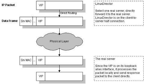 VS/DR的工作流程如圖所示:它的連接調(diào)度和管理與VS/NAT和VS/TUN中的一樣,它的報文轉(zhuǎn)發(fā)方法又有不同,將報文直接路由給目標(biāo)服務(wù)器。在VS/DR中,調(diào)度器根據(jù)各個服務(wù)器的負載情況,動態(tài)地選擇一臺服務(wù)器,不修改也不封裝IP報文,而是將數(shù)據(jù)幀的MAC地址改為選出服務(wù)器的MAC地址,再將修改后的數(shù)據(jù)幀在與服務(wù)器組的局域網(wǎng)上發(fā)送。因為數(shù)據(jù)幀的MAC地址是選出的服務(wù)器,所以服務(wù)器肯定可以收到這個數(shù)據(jù)幀,從中可以獲得該IP報文。當(dāng)服務(wù)器發(fā)現(xiàn)報文的目標(biāo)地址VIP是在本地的網(wǎng)絡(luò)設(shè)備上,服務(wù)器處理這個報文,然后根據(jù)路由表將響應(yīng)報文直接返回給客戶。