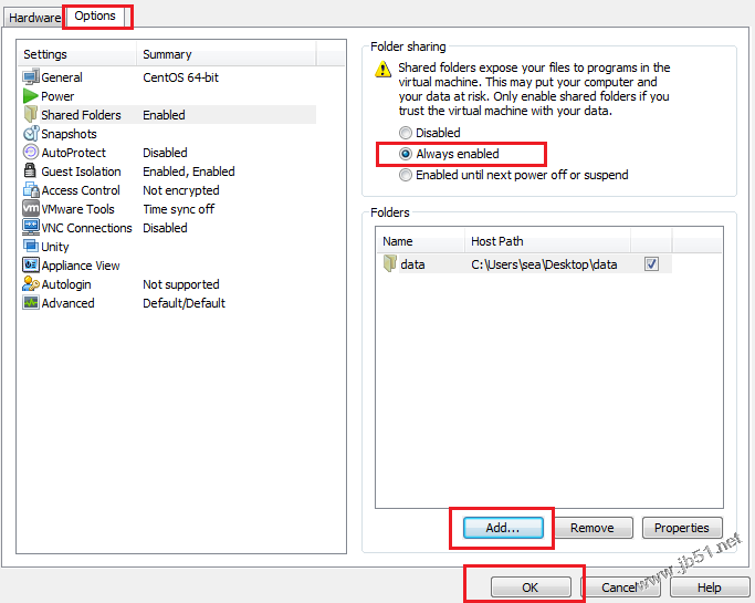 虛擬機(jī)菜單欄VM->settings,打開(kāi)下圖的中的框。選擇Options->Shared Folders->Always enabled->Add->Ok即可