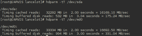 使用hdparm -tT 設(shè)備名稱 來測試,分別測試/dev/sda和/dev/md0,測試結(jié)果如下