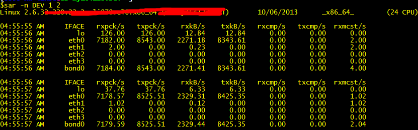 通過sar命令可以查看服務器的各個硬件的實時運轉情況。由于顯示的一些參數含義與其它命令類似,這里就不一一詳細介紹,只重點介紹