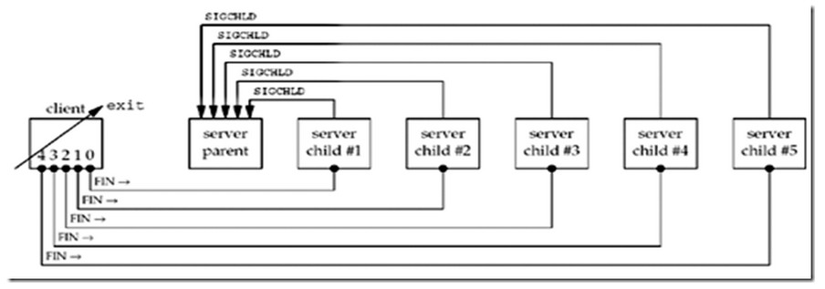 當客戶終止時,所以打開的描述子均由內核自動關閉,因此5個連接基本在同一時刻發生,相當于同時引發了5個FIN發往服務器,這會導致5個服務器子進程基本在同一時刻終止,從而導致5個SIGCHLD信號幾乎同時遞送給服務器父進程,示意圖如下所示: