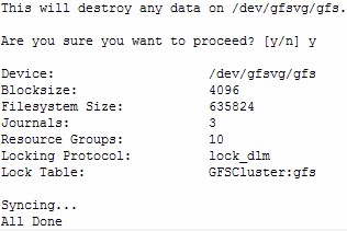 #gfs_mkfs -p lock_dlm -t GFSCluster:gfs -j 3 /dev/gfsvg/gfs