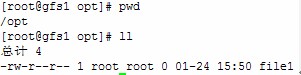 進入/opt目錄查看是否有之前在gfs1上建立的文件file1