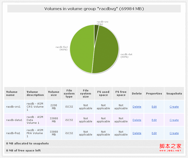 iSCSI / 邏輯卷卷名卷描述所需空間 (MB)文件系統(tǒng)類型racdb-crs1racdb - ASM CRS Volume 12,208iSCSIracdb-data1racdb - ASM Data Volume 133,888iSCSIracdb-fra1racdb - ASM FRA Volume 133,888iSCSI實(shí)際上,我們已經(jīng)創(chuàng)建了三個(gè) iSCSI 磁盤,現(xiàn)在可以將它們呈現(xiàn)給網(wǎng)絡(luò)上的 iSCSI 客戶端(racnode1 和 racnode2)。“Manage Volumes”屏幕應(yīng)如下所示: