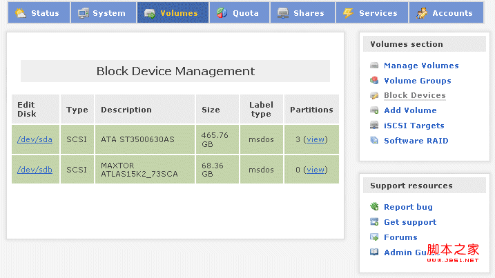 存儲(chǔ)設(shè)備(如內(nèi)置 IDE/SATA/SCSI/SAS 磁盤、存儲(chǔ)陣列、外置 USB 驅(qū)動(dòng)器、外置 FireWire 驅(qū)動(dòng)器或者任何其他存儲(chǔ)設(shè)備)可以連接到 Openfiler 服務(wù)器,并供客戶端使用。如果在操作系統(tǒng)級(jí)發(fā)現(xiàn)了這些設(shè)備,就可以使用 Openfiler Storage Control Center 設(shè)置和管理所有這些存儲(chǔ)設(shè)備。