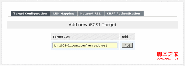 iSCSI 目標(biāo)/邏輯卷映射目標(biāo) IQNiSCSI 卷名卷描述iqn.2006-01.com.openfiler:racdb.crs1racdb-crs1racdb - ASM CRS Volume 1iqn.2006-01.com.openfiler:racdb.data1racdb-data1racdb - ASM Data Volume 1iqn.2006-01.com.openfiler:racdb.fra1racdb-fra1racdb - ASM FRA Volume 1現(xiàn)在我們來(lái)創(chuàng)建三個(gè)新的 iSCSI 目標(biāo) — 為每個(gè) iSCSI 邏輯卷創(chuàng)建一個(gè)。下面舉例說(shuō)明通過(guò)創(chuàng)建 Oracle Clusterware/racdb-crs1 目標(biāo) ( iqn.2006-01.com.openfiler:racdb.crs1) 來(lái)創(chuàng)建新的 iSCSI 目標(biāo)時(shí)所需執(zhí)行的三個(gè)步驟。這個(gè)三步過(guò)程需要對(duì)上表中列出的三個(gè)新 iSCSI 目標(biāo)中的每一個(gè)都重復(fù)執(zhí)行一遍。