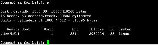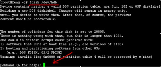 輸入 fdisk /dev/hdb 然后回車,給硬盤進行分區。如下圖