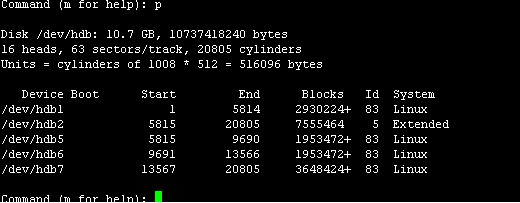 linux分區不同于windows,linux下硬盤設備名為(IDE硬盤為hdx(x為從a—d)因為IDE硬盤最多四個,SCSI,SATA,USB硬盤為sdx(x為a—z)),硬盤主分區最多為4個,不用說大家也知道…..所以主分區從sdb1開始到sdb4,邏輯分區從sdb5開始,(邏輯分區永遠從sdb5開始…)設備名可以使用fdisk –l查看