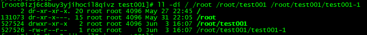 列出有關的目錄和文件:ll -di / /root /root/test001 /root/test001/test001-1