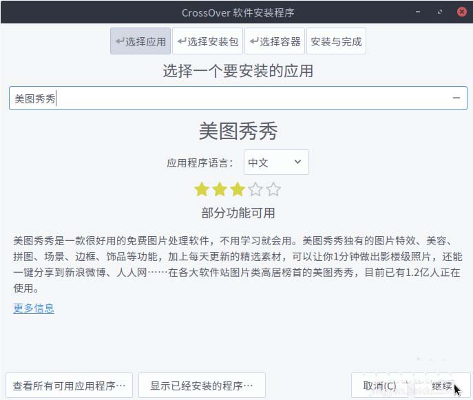 3、在彈出的 “CrossOver 軟件安裝程序 ” 的搜索框中輸入 “ 美圖 ”,選中 “ 美圖秀秀 ”,點擊 “ 繼續 ”->“ 安裝 ”