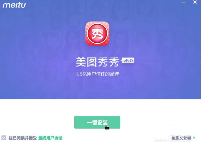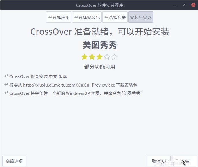 4、安裝開始后,CrossOver 會進行一些準備工作,然后自動運行 “ 美圖秀秀 ” 的安裝程序,點擊 “ 一鍵安裝 ” 開始安裝