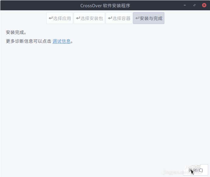 6、最后,等待 CrossOver 完成安裝后,點擊 “ 關閉 ” 退出安裝向導