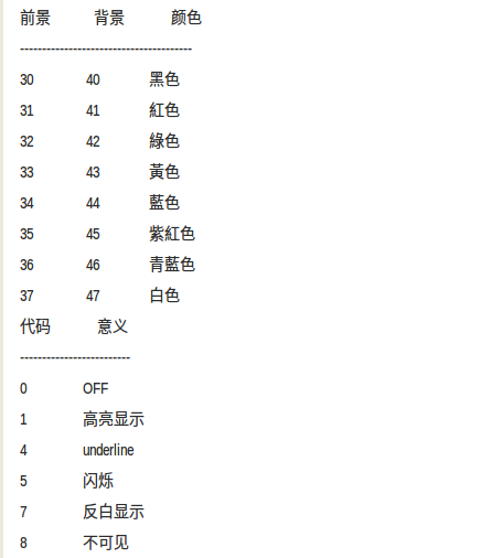 說明:/e[1;32;40m/]其中1表示高亮顯示,32表示字體顏色是綠色,40表示背景,色為黑色。更多顏色可以參考下表。