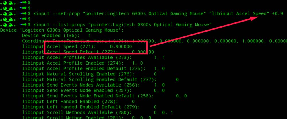 5、可以通過如下命令進行設(shè)置xinput --set-prop "pointer:Logitech G300s Optical Gaming Mouse" "libinput Accel Speed" +0.9