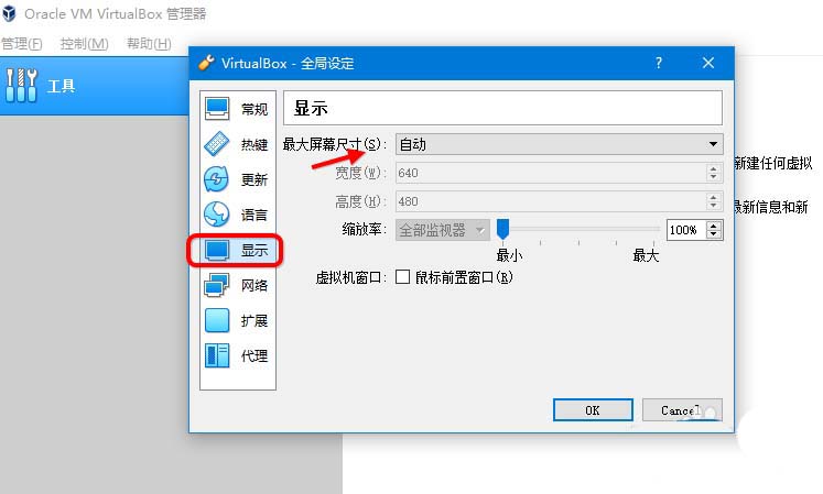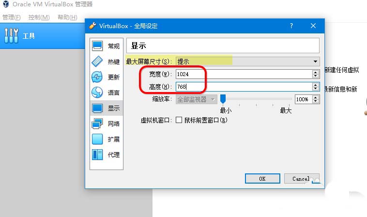 2、進入全局設置菜單,點擊“顯示”可以查看virtualbox的虛擬機分辨率顯示設置。