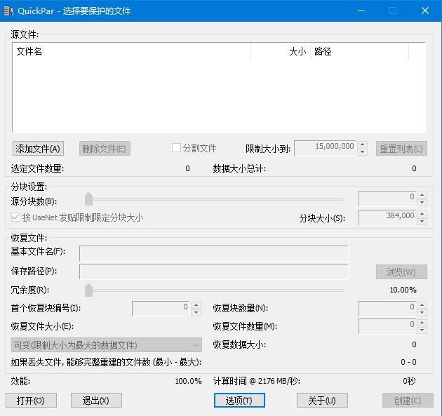 1、運行QuickPar,即進入如下的選項界面,可以對綜合、首選塊大小、檢驗和修復默認選項、文件刪除等參數進行設置。