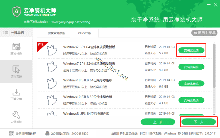 3、選擇您想要安裝的操作系統(tǒng),云凈提供Ghost版和微軟官方原版供您選擇,需要注意的是微軟官方原版中的Windows 7不帶網(wǎng)卡驅(qū)動,您需要提前下載好萬能網(wǎng)卡驅(qū)動(百度:萬能網(wǎng)卡驅(qū)動)放在您的D盤或者E盤。等系統(tǒng)安裝完成后運(yùn)行萬能網(wǎng)卡驅(qū)動安裝網(wǎng)卡驅(qū)動,避免無法上網(wǎng)。