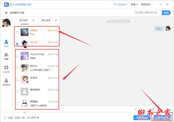 第三步:進入微信聊天記錄的恢復(fù)界面后,橙色字體是刪除的數(shù)據(jù),黑色的字體是未刪除的數(shù)據(jù)。勾選自己需要恢復(fù)的數(shù)據(jù),選擇【恢復(fù)到電腦】即將勾選的數(shù)據(jù)恢復(fù)到電腦上;選擇【恢復(fù)到設(shè)備】即將勾選的數(shù)據(jù)恢復(fù)到手機App恢復(fù)大師上(自制的恢復(fù)大師APP,非微信APP);