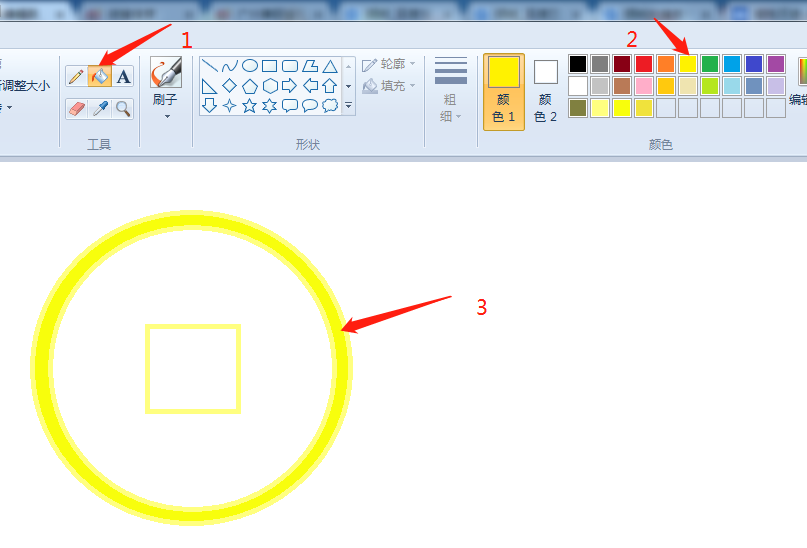 5、選擇油漆桶工具,顏色選黃色,給外圍的圓環填充顏色。