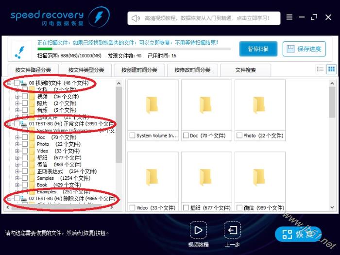 5、僅用幾秒鐘,軟件已經找到很多文件。“01 TEST-8G(H:)正常文件(2083個文件)”,表示H分區找到了2083個正常的文件。“02 TEST-8G(H:)刪除文件(609個文件)”,表示在H分區找到了609個刪除的文件,包括Shift+Del刪除的、清空回收站刪除的文件。“00找到的文件(149個文件)”,表示根據文件數據從H分區分析出來的文件。用鼠標左鍵點擊樹形控件或列表控件上的小方框,勾選需要恢復的文件,左下角顯示當前勾選的文件數量。然后點右下“恢復”按鈕。