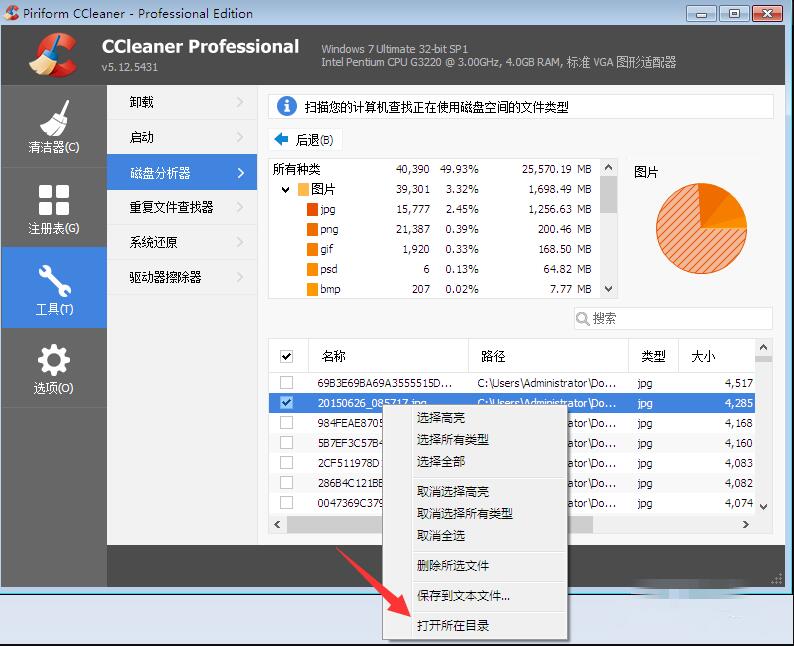 點擊其中一個文件類型,例如圖片,查看不同格式圖片的占用情況,
