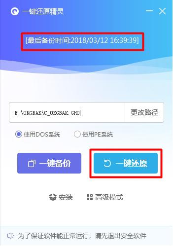 1、首先,進入OneKey一鍵還原主菜單界面,這時我們會在軟件窗口看到最后一次電腦備份系統的時間,我們點擊窗口界面當中的“一鍵還原”即可,如圖所示: