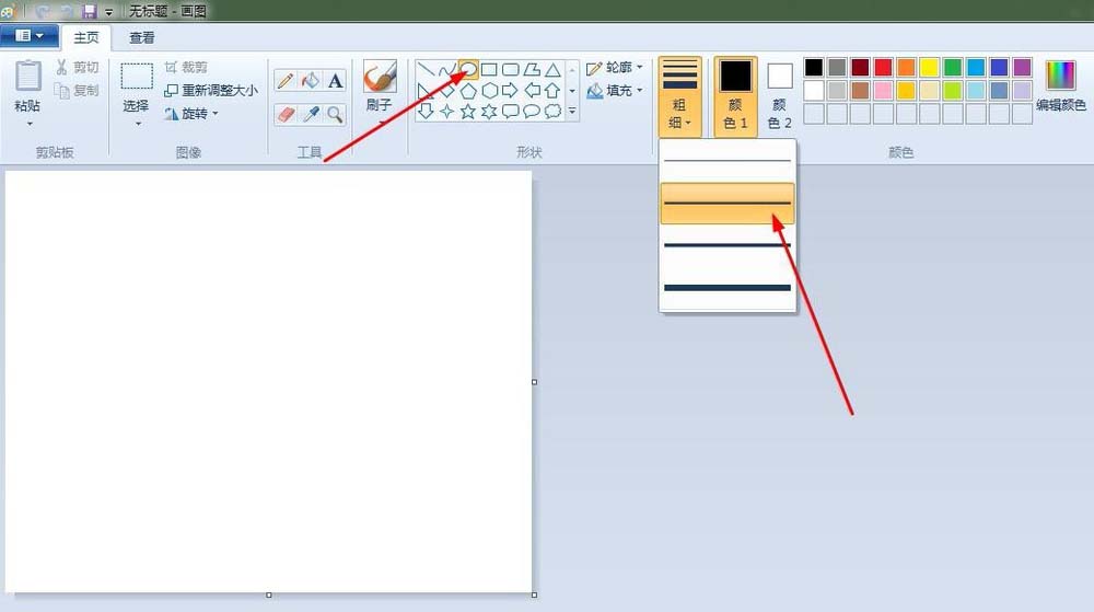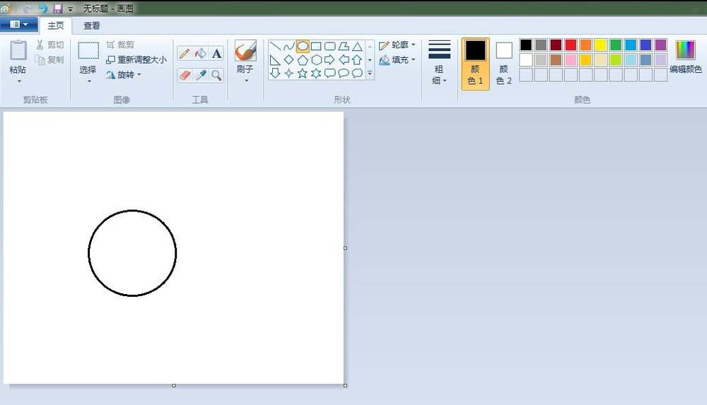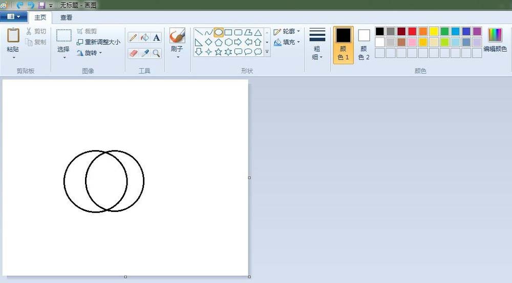 2、蘋果:點擊“橢圓形”按鈕,線條粗細(xì)(第二個),先在“畫紙”適當(dāng)位置上畫出一個圓,再畫一個和第一個有部分重疊的圓;點擊“橡皮擦”按鈕,將重疊的線條擦掉。