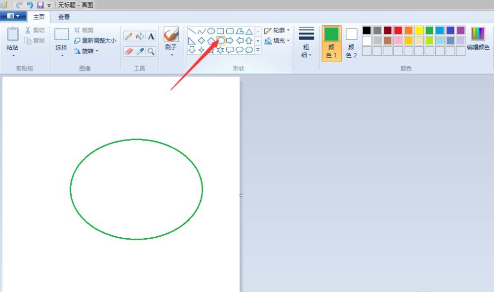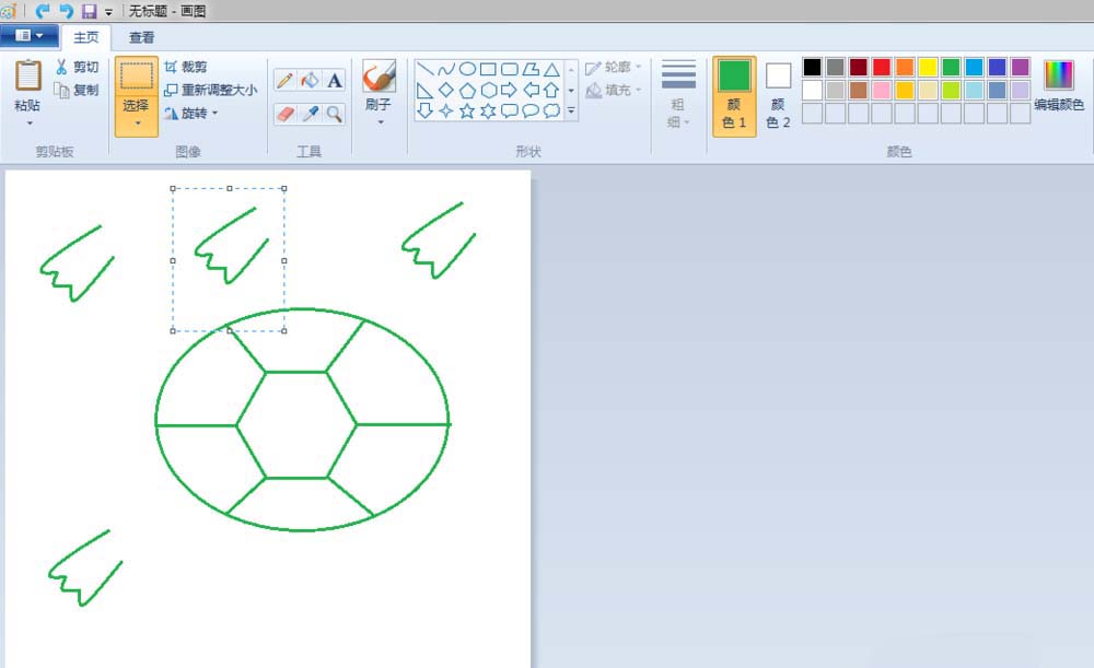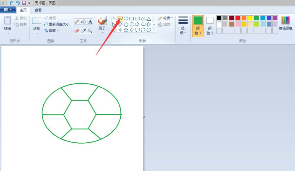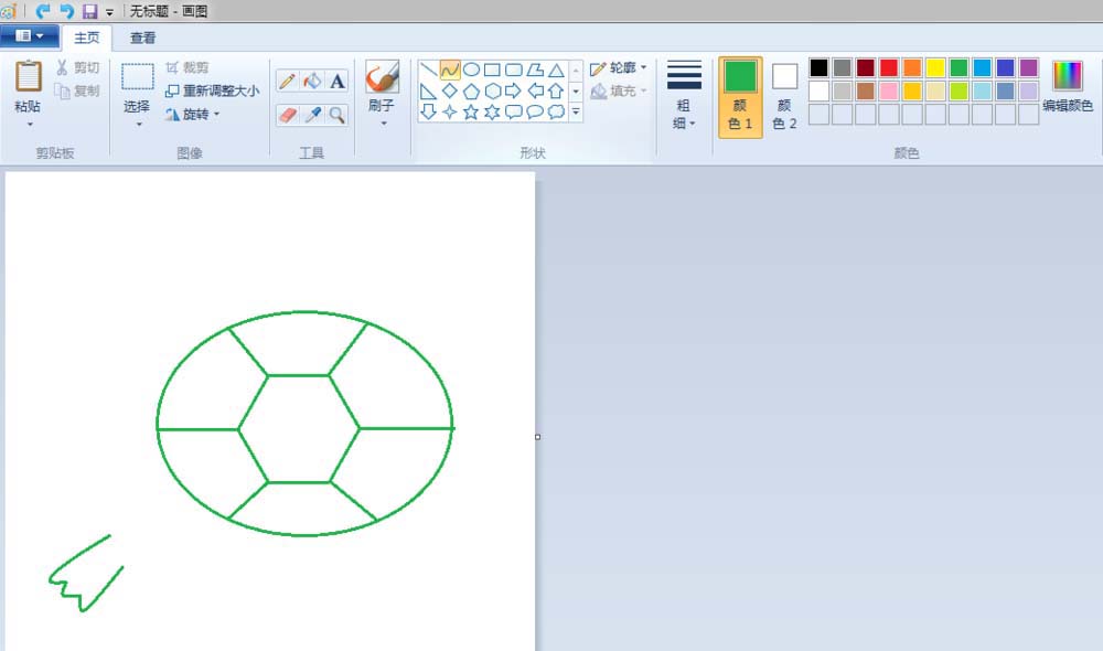2、龜殼:點擊“橢圓形”按鈕,線條粗細(第二個)之后都不變,顏色改成綠色(顏色1前景色變,顏色2背景色不變)先在“畫紙”適當位置上畫個橢圓;點擊“六變形”按鈕,在橢圓的中間畫一個六邊形;點擊“旋轉”按鈕,將畫好的六邊形,旋轉一下位置,調整到適合的大小;點擊“直線”按鈕,畫出龜殼的紋路。