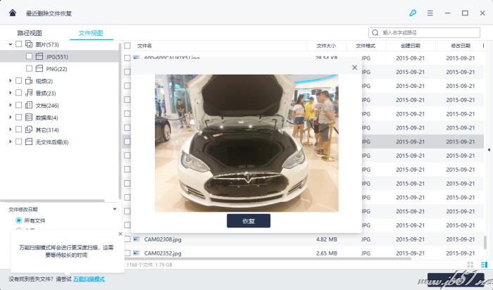 結束后,你可以預覽一些文件,點擊“恢復”,找回文件。當然有可能你會發現有些丟失的文件還是沒有找到。莫急莫急,你還可以試試“萬能掃描模式”。