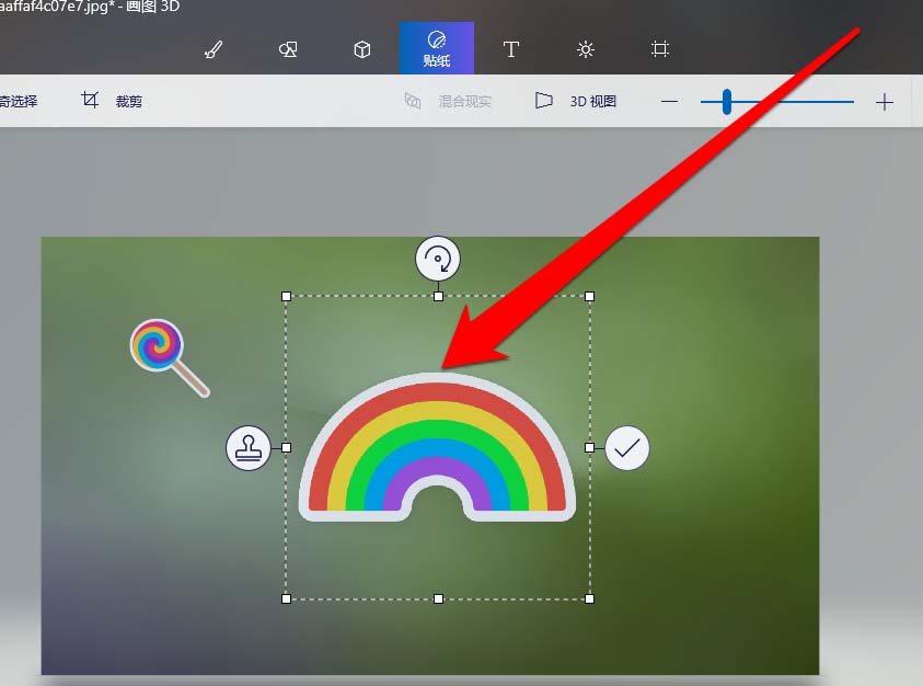 6、將貼貼紙放在圖片上,還可以進行操作。