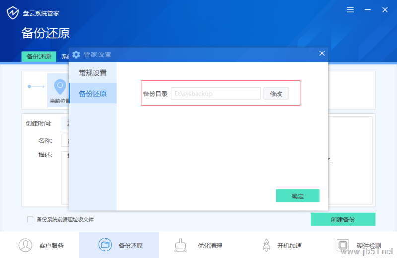 如果想讓備份的資料放到指定的位置,可以在右上角的下拉菜單“設置中心-備份還原-備份目錄”里做修改。默認備份目錄為D盤